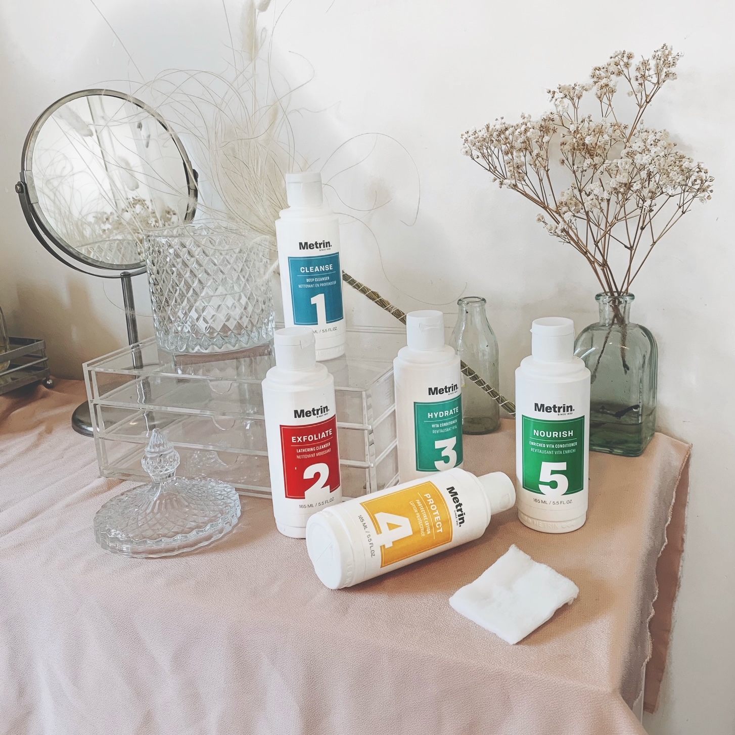 Metrin skincare has been designed as a complete skincare set. Each of the products works synergistically to cleanse, nourish and protect the skin from the harmful effects of the environment. When used together the five products produce beautiful, healthy looking skin.