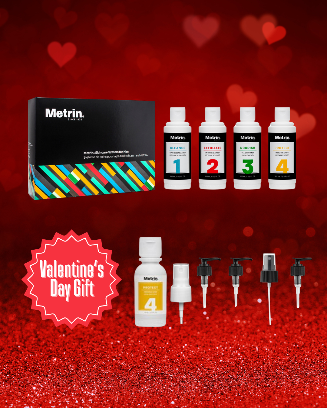 The Men’s Valentine’s Care Ritual Gift Bundle features the complete Metrin Skincare System for Him, plus exclusive bonus accessories designed to make daily skincare simple — at home or on the go.